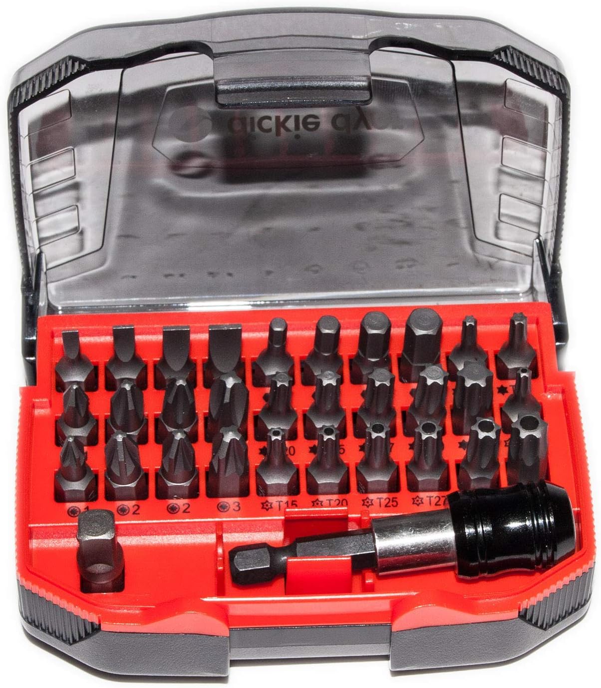 Enthält: PH1, PH2, PH2 & PH3; PZ1, PZ2, PZ2 & PZ3; SL3, SL4, SL5 & SL6; T10, T15, T20, T25, T27, T30 & T40; 4x Sechskantbits (3,4,5 & 6mm); & 7x Sicherheitsbits (T10, T15, T20, T25, T27, T30 & T40)