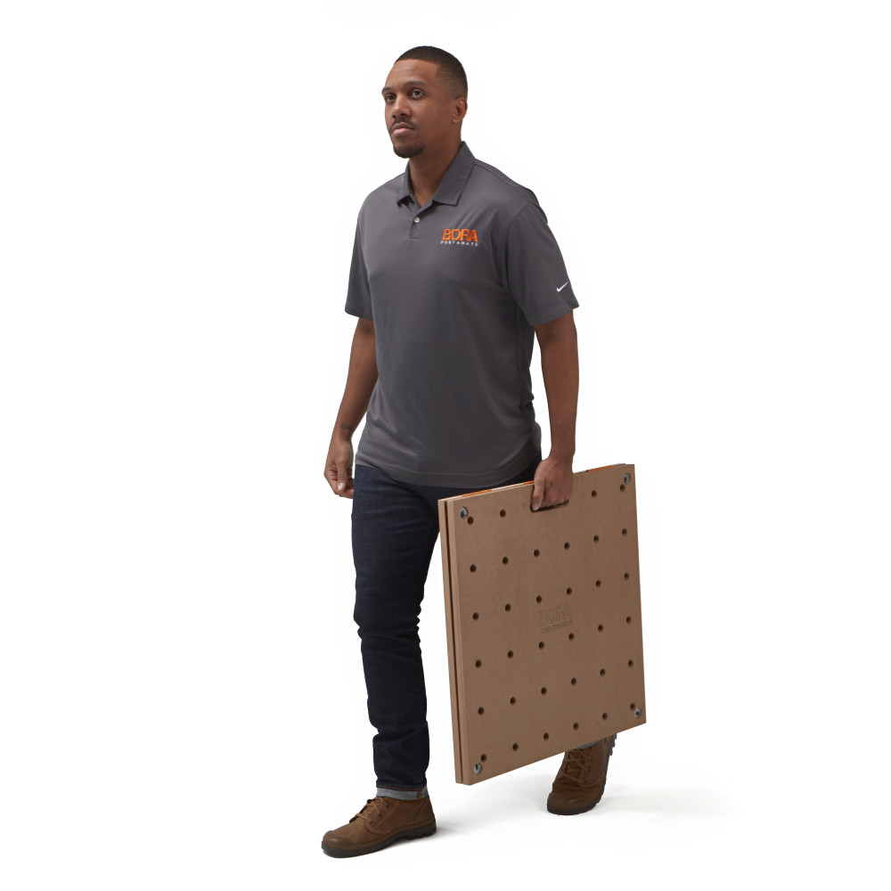 Die mobile, tragbare Arbeitsplatte lässt sich dank des Klappmechanismus schnell auf- und abbauen und eignet sich damit ideal für den Einsatz unterwegs. Die robuste, 18 mm starke Tischplatte verfügt über einen integrierten Trageschlitz, der einen einfachen Transport ermöglicht.