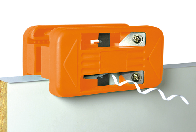 Setzen Sie den Kantenschneider auf die Werkstückkante. Drücken Sie anschließend beide Seiten gegen das Werkstück und führen Sie den doppelseitigen Kantenschneider in die durch den Pfeil gekennzeichnete Richtung. Der Kantenschneider ist für einen Schnittbereich zwischen 13 mm und 25 mm ausgelegt. Das erste Messer führt einen geraden Schnitt aus, während das zweite Messer so eingestellt werden kann, dass ein abgeschrägter Schnitt entsteht. Beide Schneiden sind aus gehärtetem Stahl gefertigt und können ausgetauscht werden, wenn sie abgenutzt sind.