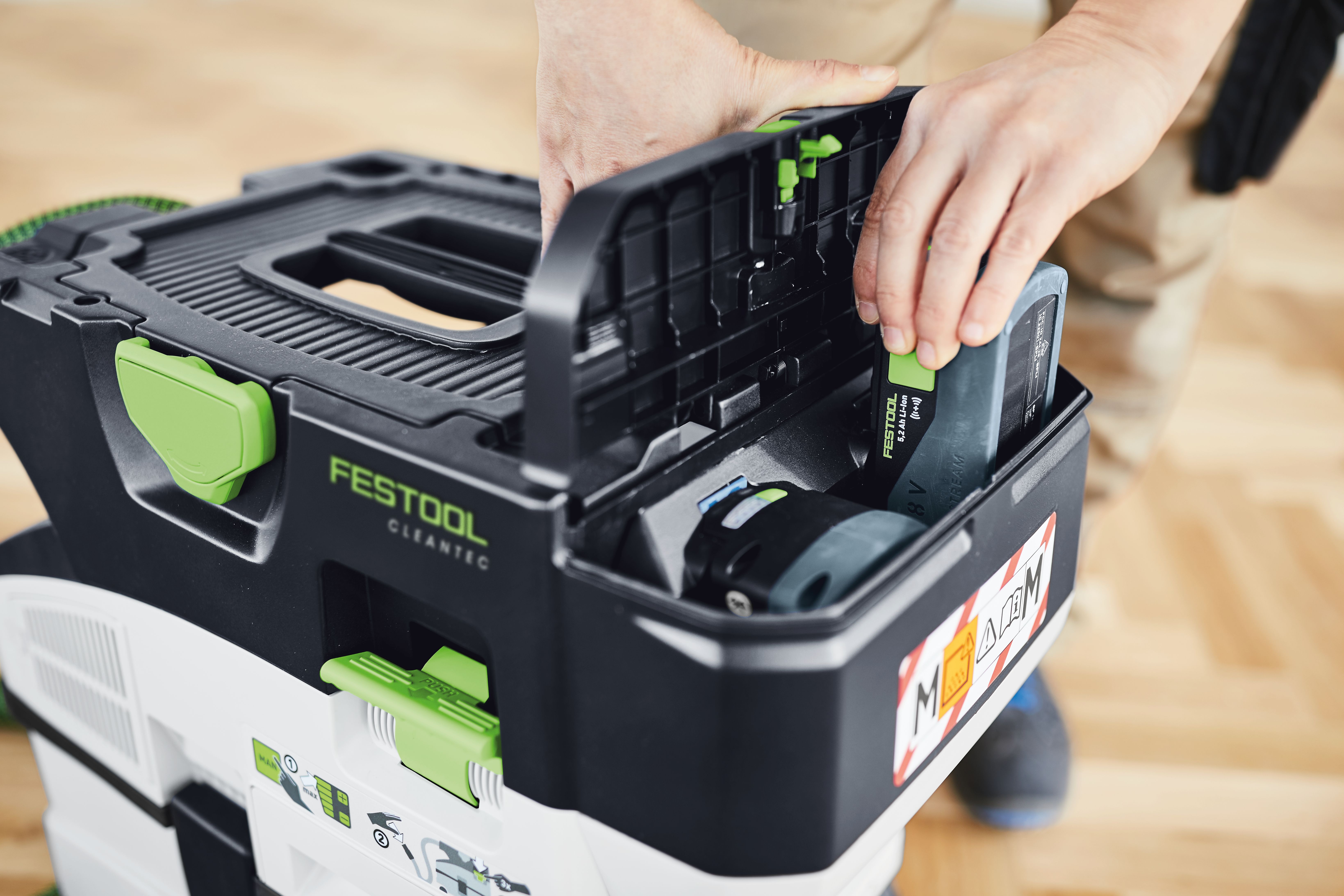 - Staubfreie Akku-Anwendungen: Perfektes Zusammenspiel mit den Festool Akku-Werkzeugen für mobiles Sägen, Schleifen oder Bohren