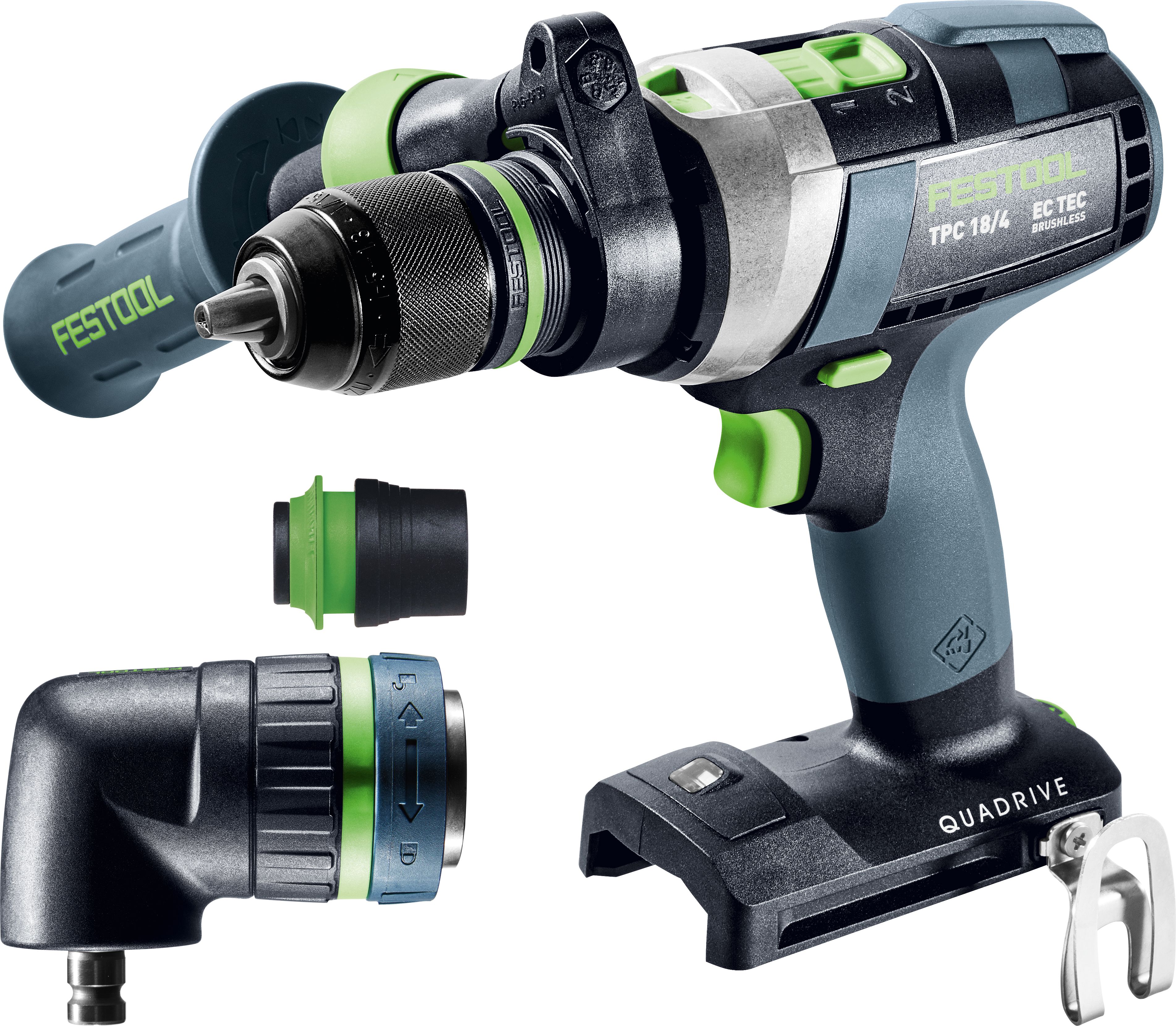 Kraftvoll. Vielseitig. Mit 4 Gängen für jede Anwendung. Mit dem besten Schaltkonzept, das ihr je bedient habt. Ganz gleich, ob in Holz, Metall oder dank zuschaltbarem Axialschlag auch in Mauerwerk: Der TPC ist extrem hart im Nehmen und verfügt mit seinem bürstenlosen EC-TEC Motor über enorme Belastbarkeit und Ausdauer. Zahlreiche Vorsätze, kombiniert mit perfekt abgestimmtem Zubehör, machen den QUADRIVE zu einem unübertroffenen Schlagbohrschrauber für unterschiedlichste Einsatzmöglichkeiten. Und gefährliches Verdrehen des Handgelenks bei plötzlichem Blockieren des Einsatzwerkzeugs? Unser intelligenter KickbackStop minimiert das Risiko, dass es so weit kommt. Probiert ihn aus: den besten Schlagbohrschrauber, den Festool je gebaut hat!