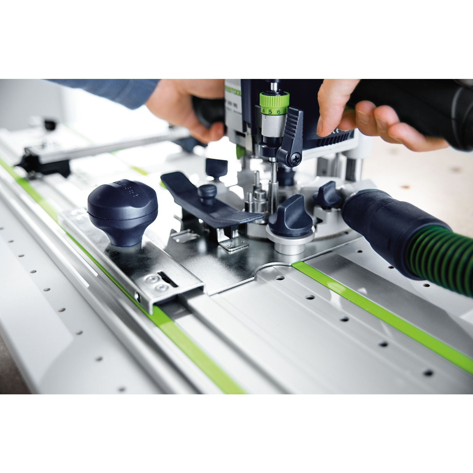 - Die Führungsschiene wird präzise mit 9,5, 16 oder 32 mm Randabstand über den Längsanschlag in Längsrichtung positioniert