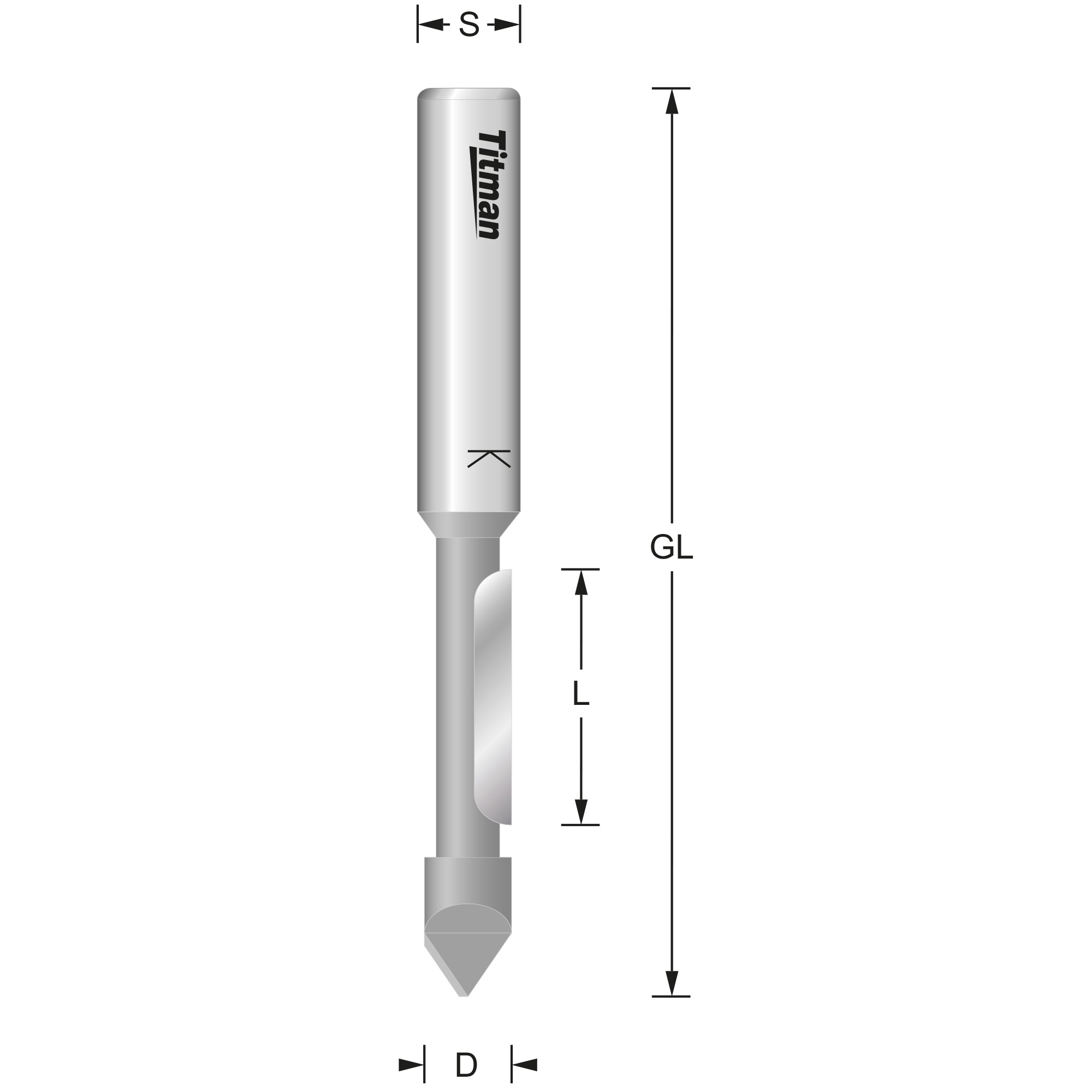 Kopierfräser. Zum Bündigfräsen von dünnwandigen Platten sowie Sperrholz und Aluminium. Gebräuchlich im Caravanbau. Dachförmige Stirnseite zum Eintauchen. Rechtslauf. |
