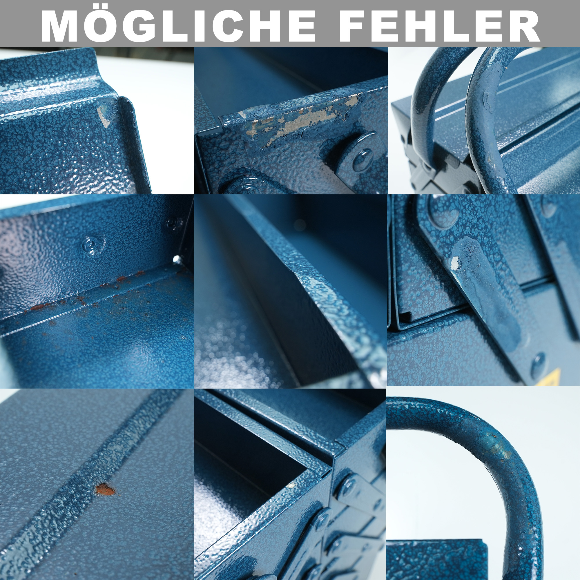 Die Werkzeugkiste ist mit einer widerstandsfähigen Pulverbeschichtung in Hammerschlagoptik versehen. Diese schützt zuverlässig vor Kratzern und Korrosion und sorgt gleichzeitig für eine langlebige und hochwertige Oberfläche.