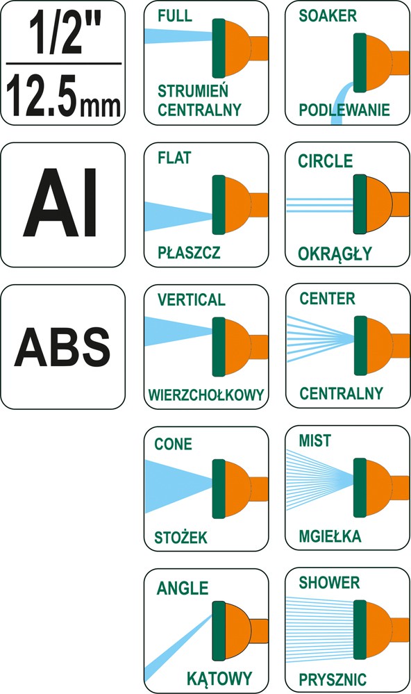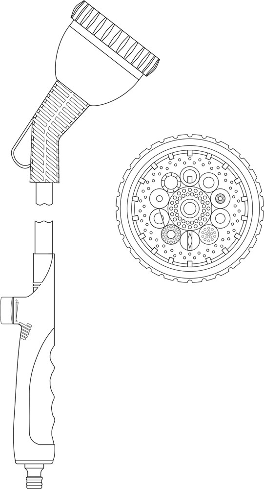 Dieser verfügt über eine Wasserdurchflussregulierung . Dem Benutzer stehen 10 Strahlarten zur Verfügung (Bewässerung, Nebel, Zentralstrahl, Brause, Mantelstrahl, Kegelstrahl, Spitzenstrahl, Winkelstrahl, Rundstrahl, Zentralstrahl).