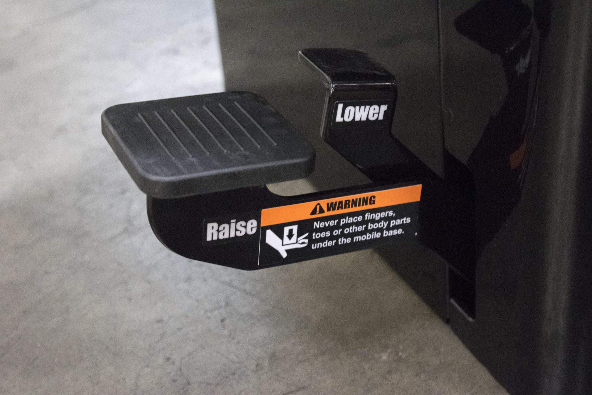 Einfaches Anheben der Säge mit einem Fußpedal möglich. Im ausgekuppelten Zustand liegt die Säge fest auf dem Boden auf, sodass keine zusätzliche Bremse benötigt wird und die Rollen entlastet sind. Die aus Polyurethan gefertigten Räder lassen sich in einem 360° Winkel beliebig drehen, somit kann die Maschine bei Nichtgebrauch schnell und einfach verschoben werden.