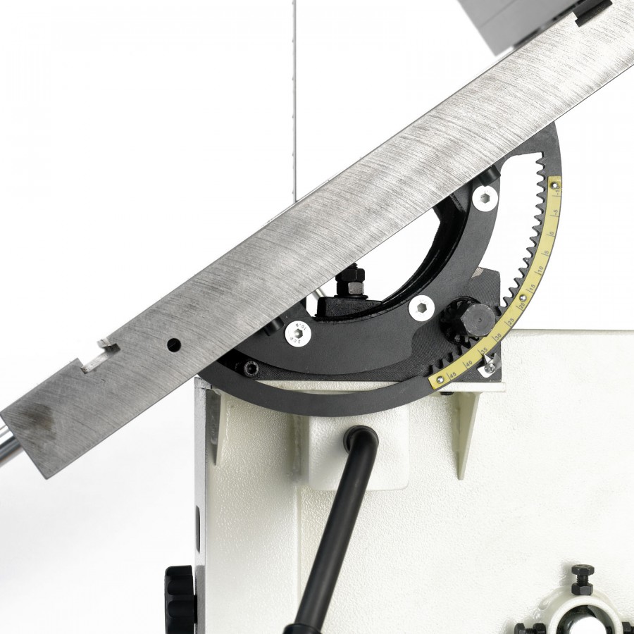 Wie bei großen Industriemaschinen verleiht das Doppelt geführte Aufhängungselement für den Tisch eine felsenfeste Verbindung und somit einen hoch belastbaren Tisch, der mit einem schnell und leicht zugänglichen Hebel im gewünschten Winkel verriegelt wird. Die Neigung wird wie gewohnt über Zahnstangen eingestellt.