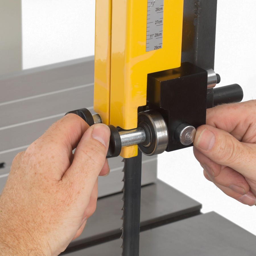 Der Aufbau und die Anordnung der Bandführungselemente wurde optimiert, so dass ein perfektes einstellen auf das jeweilige Bandsägeblatt nicht mehr durch Sicherheitsmerkmale verdeckt wird und die Sichtbarkeit der perfekten Position sofort gegeben ist.