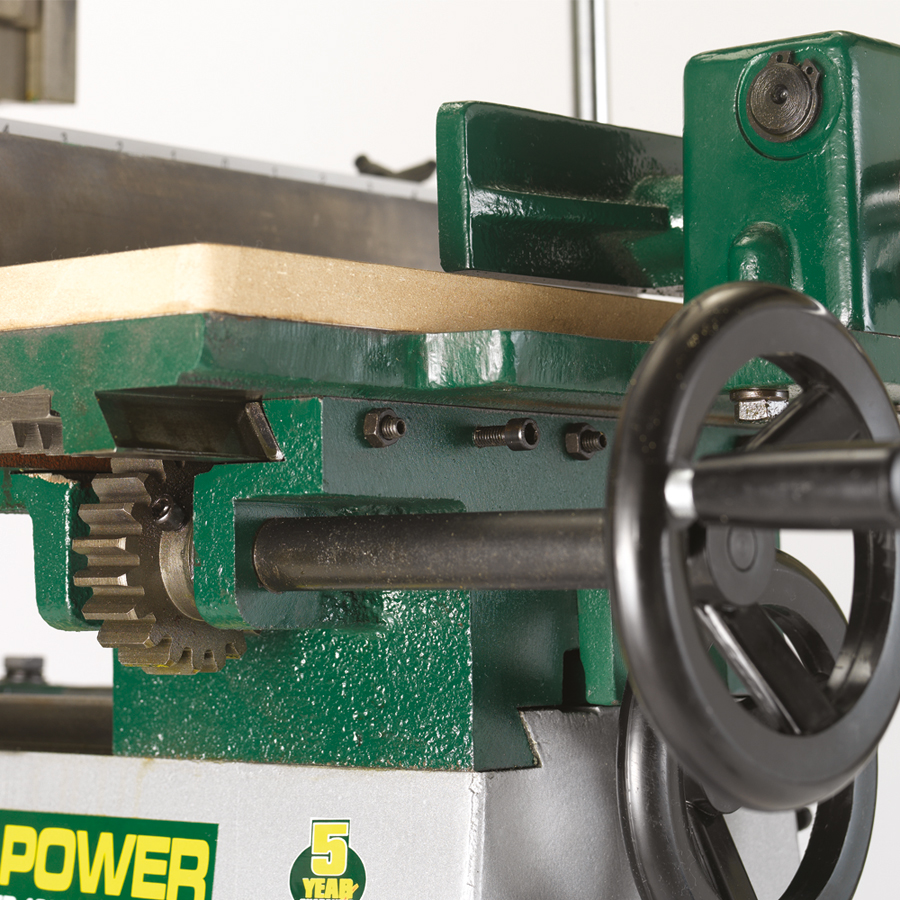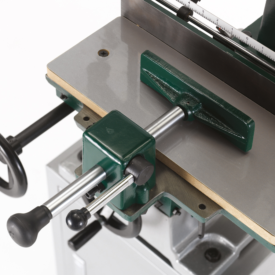 - Komplette Tischverstellung seitwärts und Tiefeneinstellung wird werkzeuglos über Handräder vorgenommen. Hohe Präzision und kein Entfernen des Werkstückes nötig