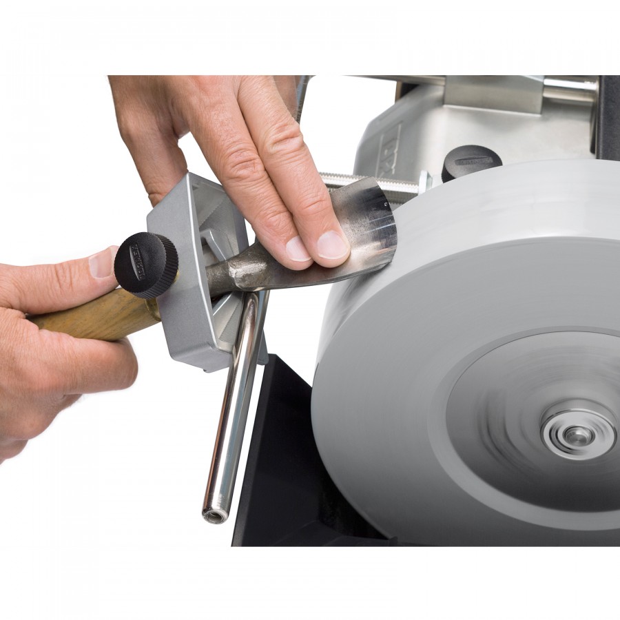 Bei Drechsel-Werkzeugen können Sie mit dem Montagesatz BGM-100 die SVS-50 auch auf einer Doppelschleifmaschine verwenden, wenn Sie bei neuen Werkzeugen viel Stahl abtragen müssen, um ein Profil zu verändern. Hierbei müssen Sie jedoch darauf achten, dass die Schneide nicht überhitzt. Nachdem Sie die Grobform auf der Doppelschleifmaschine hergestellt haben, lassen Sie das Werkzeug in der Vorrichtung und wechseln Sie zur Tormek-Maschine, um der Schneide die endgültige Schärfe zu verleihen.