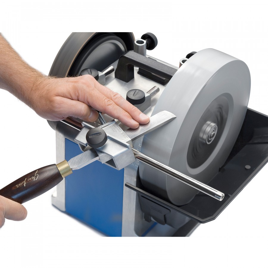 Die geschlossene Aufnahme wurde für das Präzisionsschleifen von geraden und schrägen Meißeln zum Drechseln und Schnitzen entwickelt. Da der Meißel in der Mitte der Aufnahme montiert ist, müssen Sie das Werkzeug nur einmal montieren, um beide Fasen zu schleifen. Wenn eine Seite fertig ist, drehen Sie die Vorrichtung einfach um und schleifen die andere Seite, bis sie symmetrisch sind.