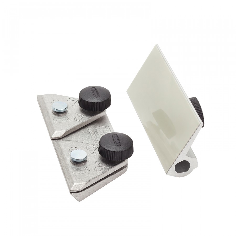 Die Scheren werden in einer Halterung montiert, die frei auf einer Stützplatte aufliegt. Der Schleifwinkel kann so eingestellt werden, dass der vorhandene Schneidenwinkel exakt reproduziert wird.