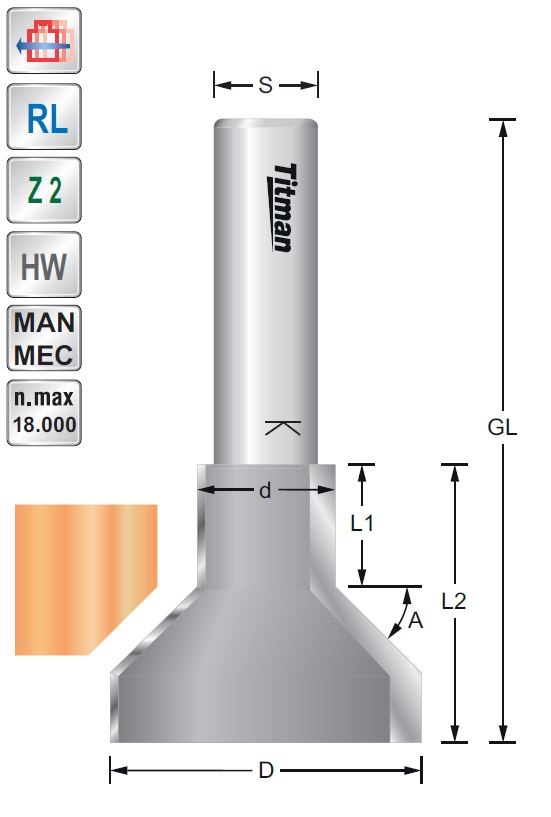 Hochleistungs-Abkantprofilfräser Hartmetall bestückt für die Industrielle NutzungHöchste StandzeitZum Abkanten, Profilieren, Formatieren in einem ArbeitsgangUmfangschneidendRechtslaufHandvorschub Industriequalität, höchste AusführungGeeignet für alle Holzsorten, im besonderen Harthölzer, MDF, Multiplex, bedingt auch in Kunststoffe und belegte Materialien.Abkantprofilfräser HW Z=2Maximal zulässige Drehzahl: 18.000 U/min