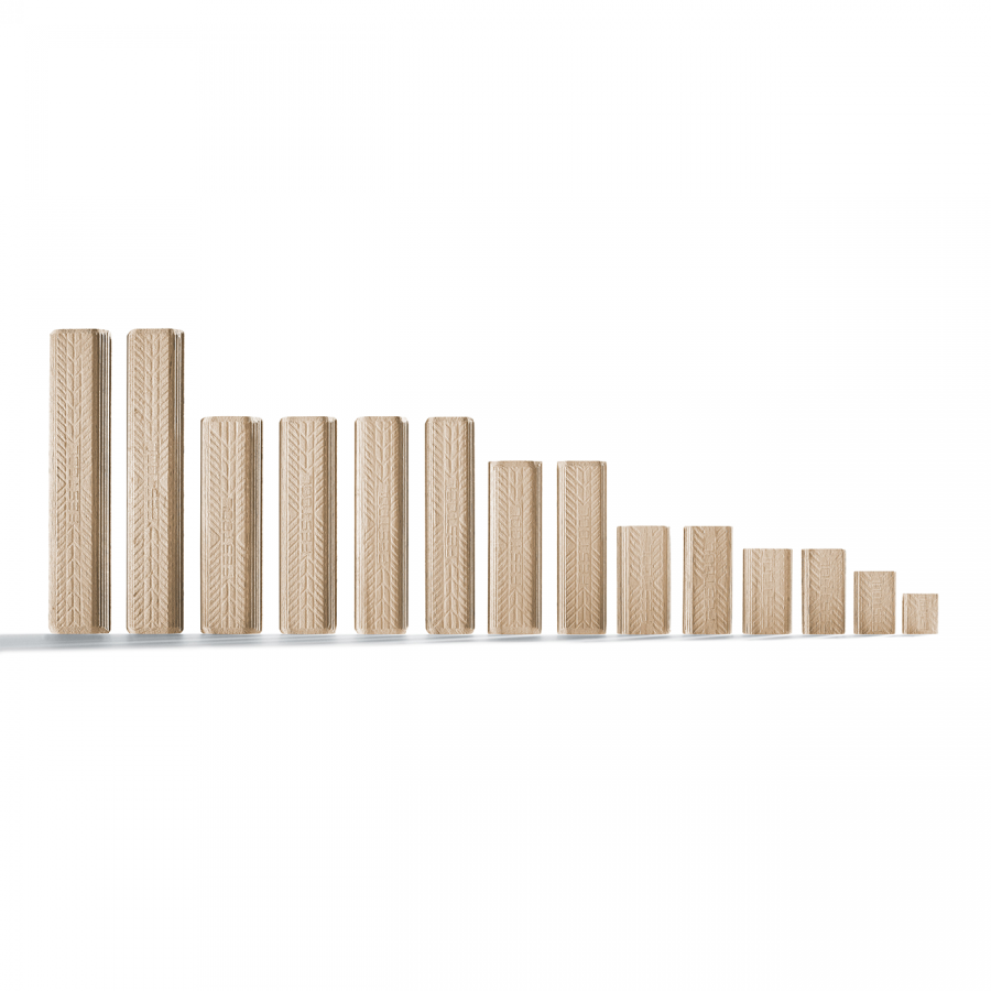 Mit der Dübelfräse DOMINO DF 500 nutzen Sie Dübel in der Größe von 4x20 mm bis 10x50 mm. Für die DOMINO XL DF 700 können Sie Dübel in der Größe ab 8x80 mm bis 14x140 mm sowie die Eck- und Flächenverbinder einsetzen.