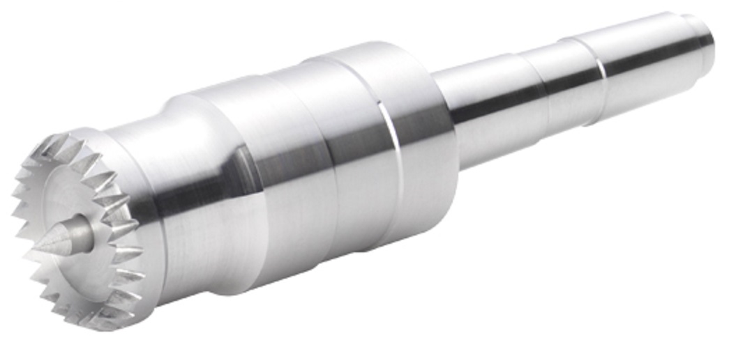 Der zentrale Positionierstift des Mitlaufkörners zieht sich beim Anpressen durch die Drehbank in das Gehäuse zurück. Dadurch bleibt der Zahnkranz um den Umfang erhalten, der das Werkstück äußerst sicher hält. Der gleichmäßige Anpressdruck auf die Zähne reduziert zudem Vibrationen im Holz beim Drechseln.