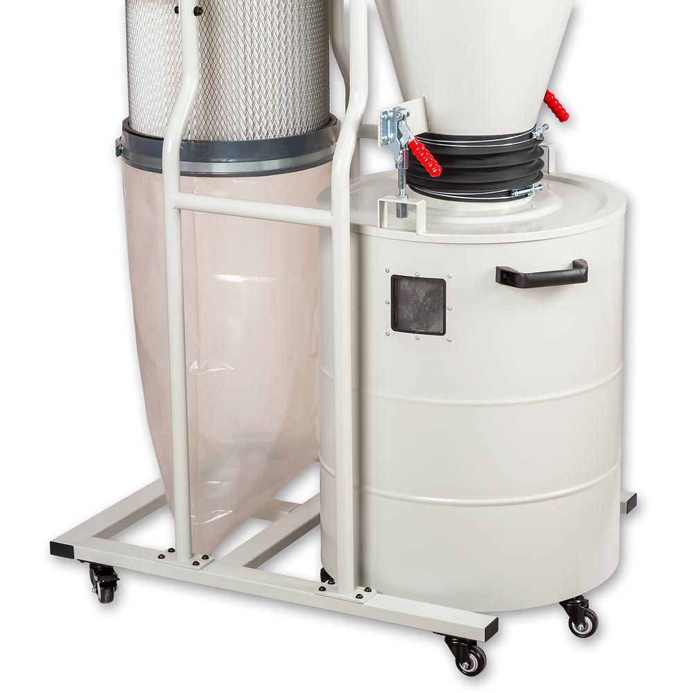 Zyklon-Absauganlagen trennen grobe Abfallpartikel vom feinen Staub, was im Vergleich zu anderen Bauarten zu einer deutlich effizienteren Absaugung führt. Nur eine geringe Menge Staub gelangt zum Patronenfilter, sodass dieser seltener gereinigt werden muss. Zur Ausstattung gehören ein leistungsstarker Induktionsmotor, hohe Mobilität, ein großzügiges Fassungsvermögen sowie die Möglichkeit, bis zu drei Maschinen anzuschließen.